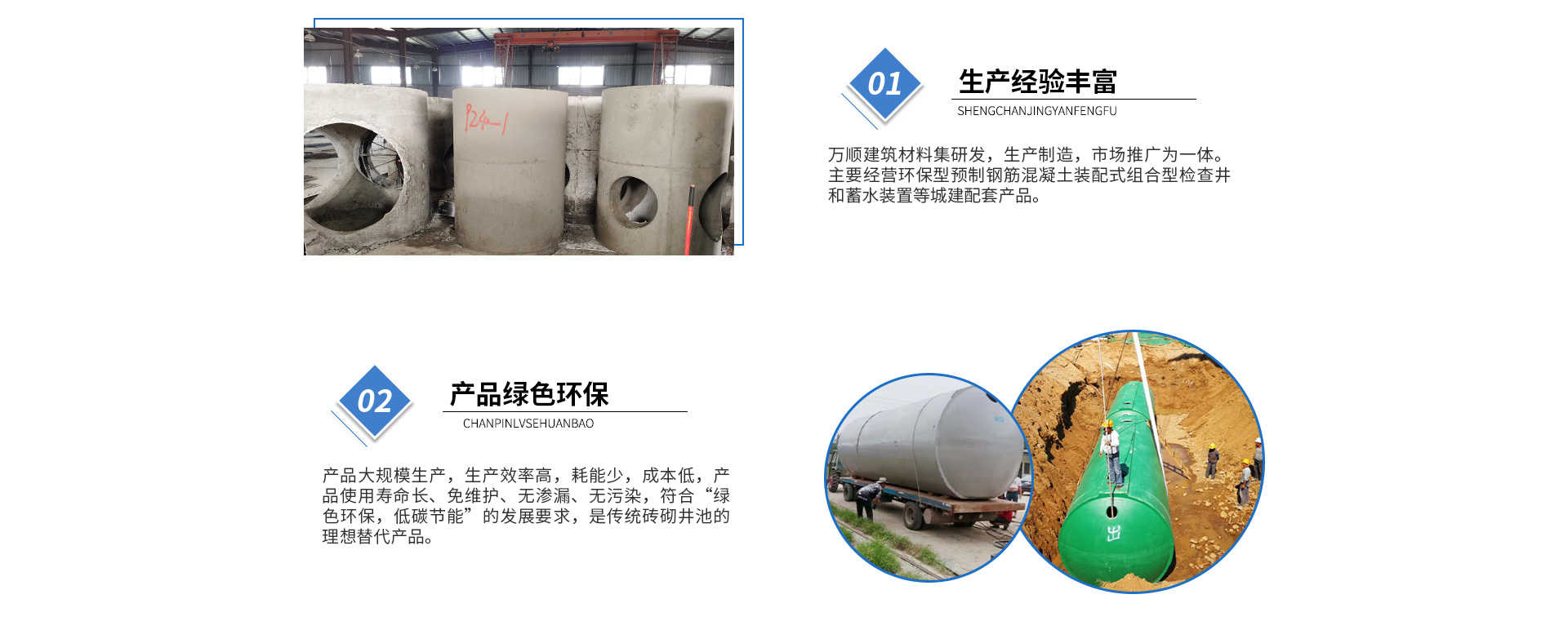 黃山市萬順建筑科技有限公司是集研發,生產制造,市場推廣為一體的綜合性企業。公司主要經營環保型預制鋼筋混凝土裝配式組合型檢查井和蓄水裝置等城建配套產品。產品生產過程采用獨特的生產工藝,機械化流水作業。產品大規模生產,生產效率高,耗能少,成本低,產品使用壽命長、免維護、無滲漏、無污染,符合“綠色環保,低碳節能”的發展要求,是傳統磚砌井池的理想替代產品。